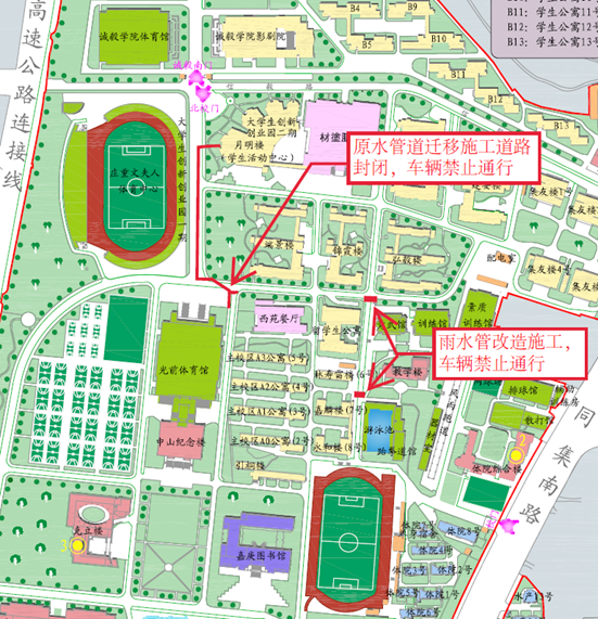 為加快推進“六社區6#組團新建學生公寓項目”建設,配合做好校園雨污管道正本清源改造,盡量減少校園施工對師生出行的影響,決定利用五一假期前后開展市政原水管道遷移施工、留學生公寓東側石板路雨水管改造、集誠B樓至南側主路中線雨水管改造、音樂學院基石廣場西側石板路污水管改造。施工期間對部分道路實行交通管制,具體如下: