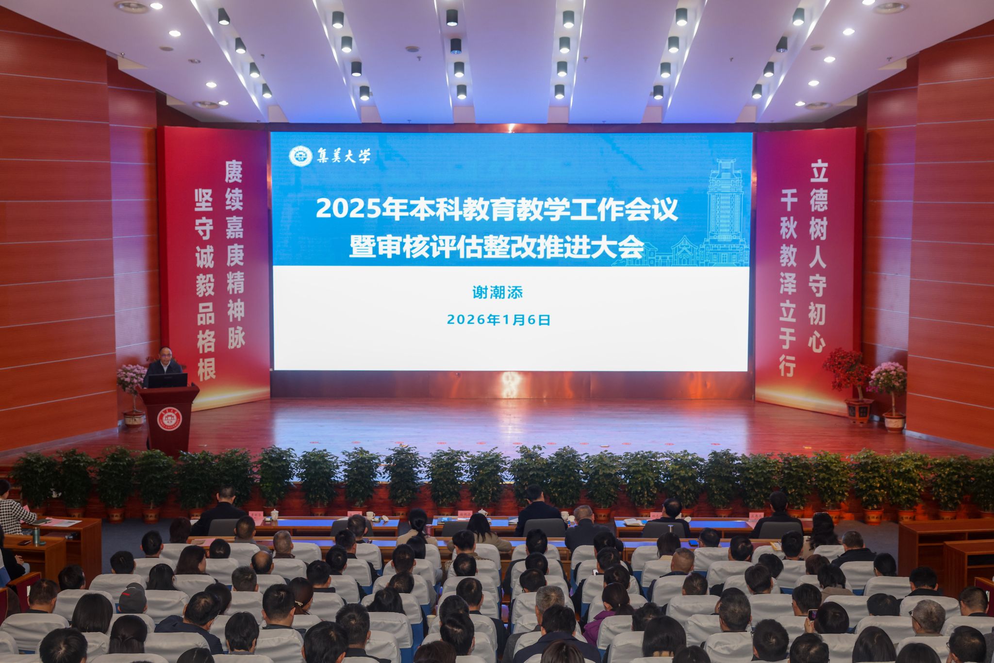校黨委副書記、校長謝潮添作主旨報告。他全面總結本科教育教學審核評估整改工作的階段進展與成效,深入剖析當前本科人才培養中存在的突出問題與薄弱環節,從落實立德樹人根本任務、優化專業結構、深化教育教學改革、深化產教融合、建強教育教學隊伍,優化質量保障體系等六個方面系統部署下一階段重點任務。他強調,各單位要提高政治站位,強化責任擔當;要強化統籌協調,破除壁壘梗阻;要堅持對標對本,確保整改進度;要突出示范引領,強化典型帶動;要嚴肅督查問責,倒逼工作落實。