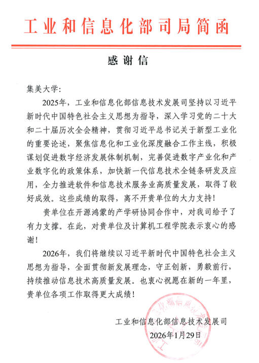 近日,我校收到工業和信息化部信息技術發展司發來的感謝信,信中對我校計算機工程學院大力支持該司工作,特別是在開源鴻蒙產學研協同合作中給予的有力支撐表示感謝。