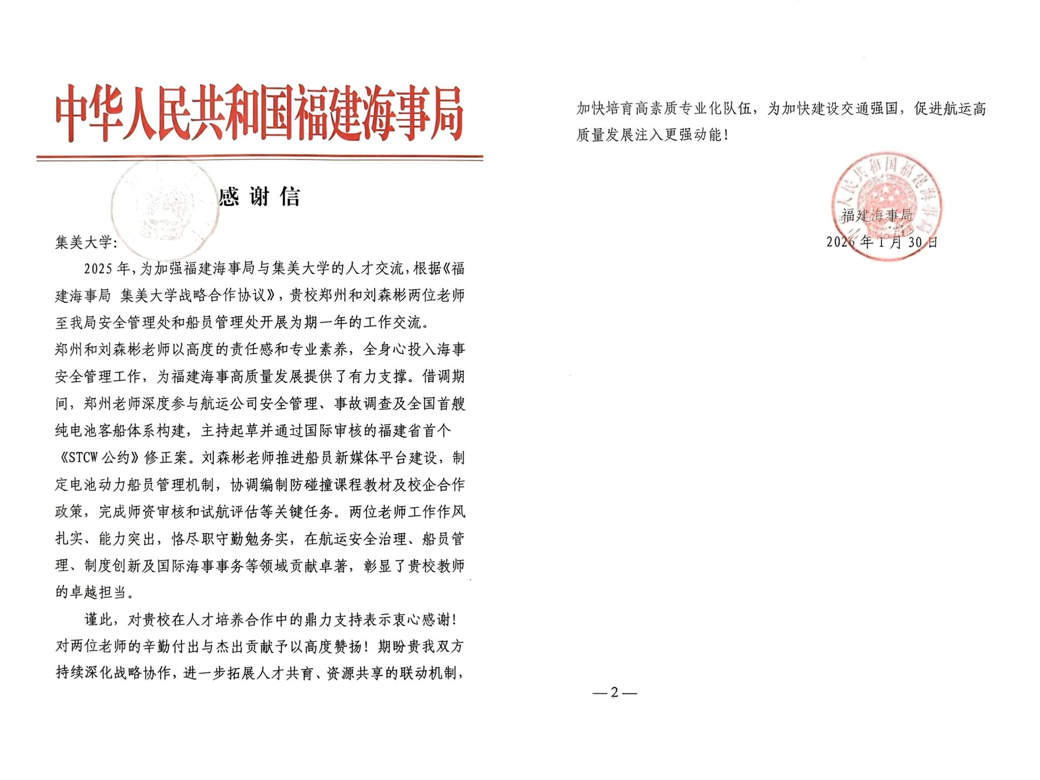 該提案由我校鄭州、俞萬能、范金宇、吳德烽、黃朝明、王益斌等教師牽頭,聯合福建、廈門、廣東、上海四地海事局共同起草,經交通運輸部海事局審批后正式提交IMO,并在官網公示。這是福建省首次主持聚焦“人的因素”議題的提案,獲得部委批準并提交IMO,具有重要的開創性意義,獲福建海事局通報表揚。提案的通過將進一步完善國際航運安全保障體系,為全球船舶技術人才培養提供重要參考。