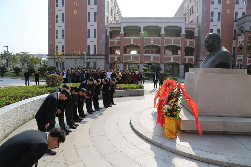 同日上午,校黨委書記辜芳昭、校長李清彪、校黨委副書記葉美萍,陳嘉庚先生后裔、校友會及誠毅學院師生代表向李尚大先生銅像敬獻花籃。