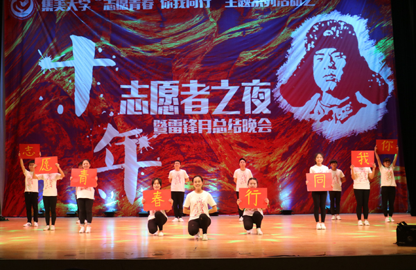 晚會以“志愿十年,我們一直在路上”為主線,分為“你·志愿青春”“我·攜手同行”“他·禮贊集大”三個部分。在小品《心火燎原》中,我校3名西部計劃志愿者從遙遠的西藏、新疆、寧夏發來祝福,用質樸的語言,述說著他們的堅守與快樂,感動著在場的觀眾;手語操《稻香》以無聲的演繹,表達出志愿者不忘初心、在志愿服務的路上繼續前行的決心;原創話劇《美麗集大,我們共同守護》重現了我校師生眾志成城抗擊“莫拉蒂”臺風、開展災后重建的感人事跡。