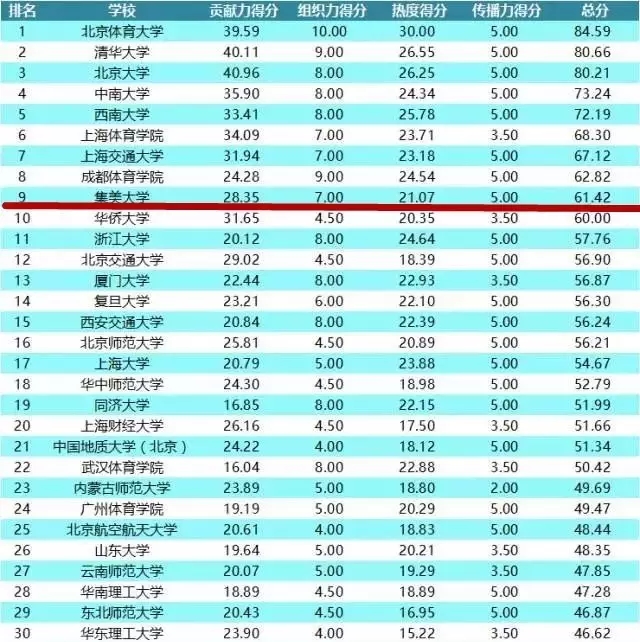 近日,“2016中國高校體育競賽榜”公布,在參評的627所高校中,集美大學排名全國第九,全省第一。