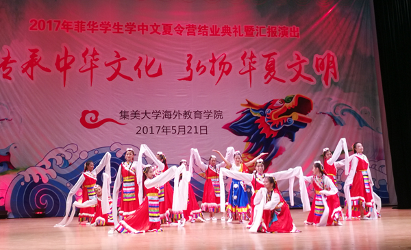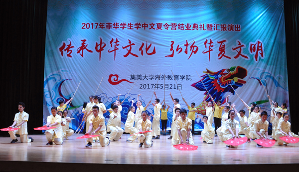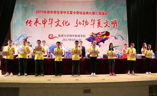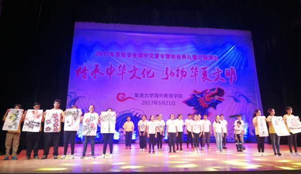 5月21日下午,2017年“中國尋根之旅”——菲律賓華裔學生學中文夏令營結業典禮暨匯報演出在我校古龍大禮堂舉行。菲律賓華文教育研究中心主席黃端銘,菲華漢語進修團(集大團)團長鄭威廉、副團長倪瓊妹、張芳,我校國際合作交流處負責人和海外教育學院有關領導出席了典禮。