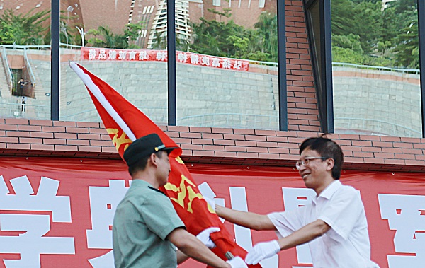 校黨委書記辜芳昭向承訓部隊教官授予集美大學軍訓團團旗。主席臺領導為2017級新生代表佩戴?;铡①浰汀蛾惣胃褡x本》。