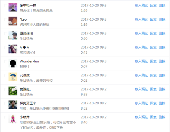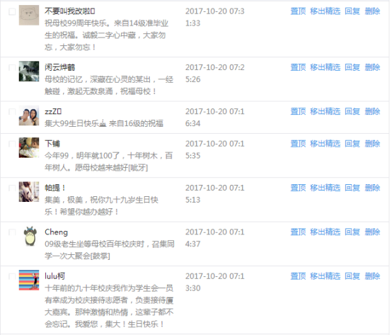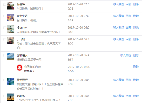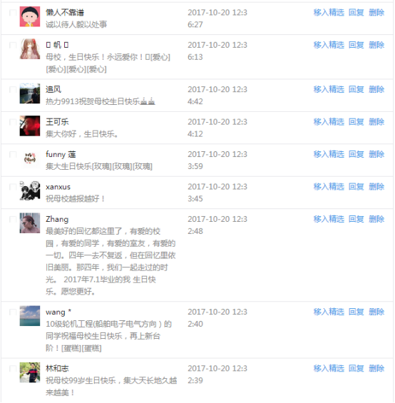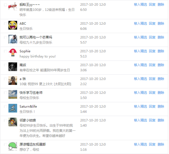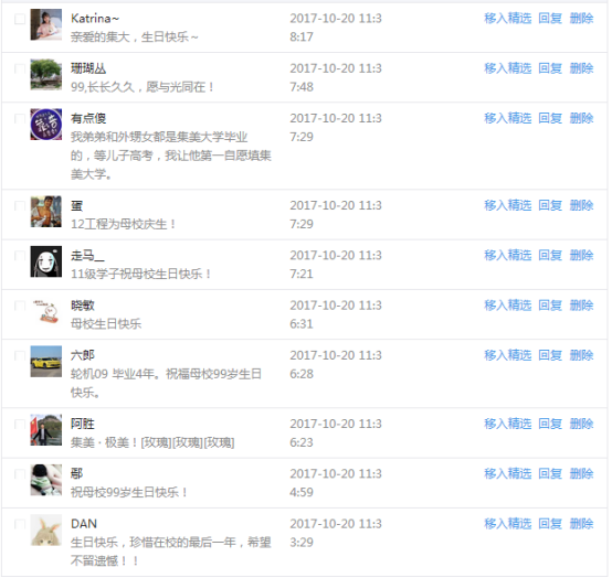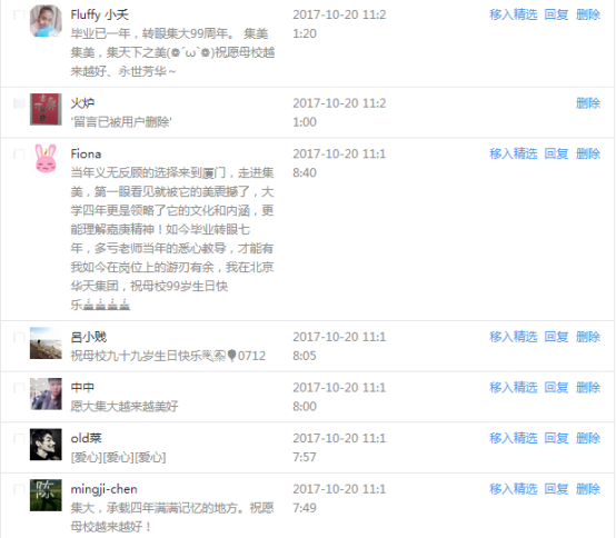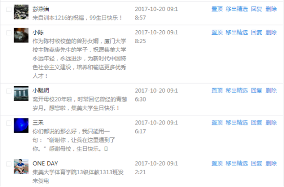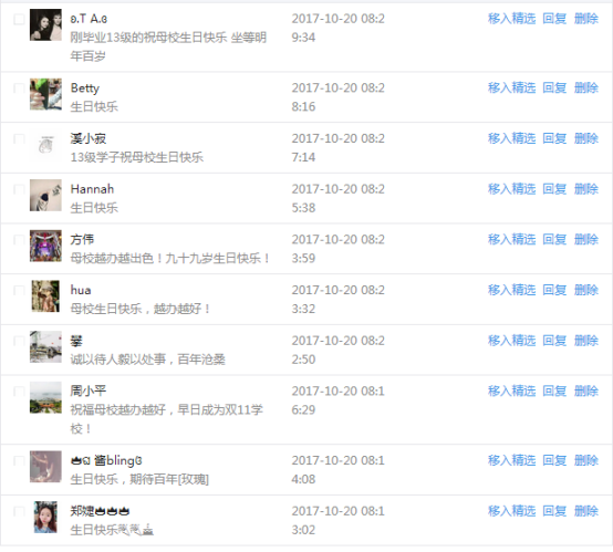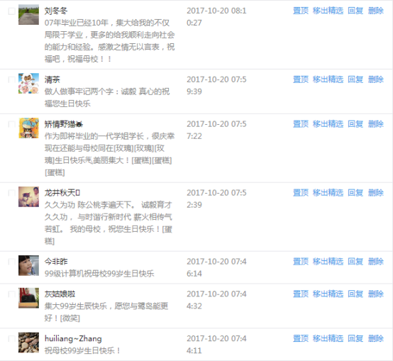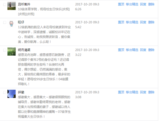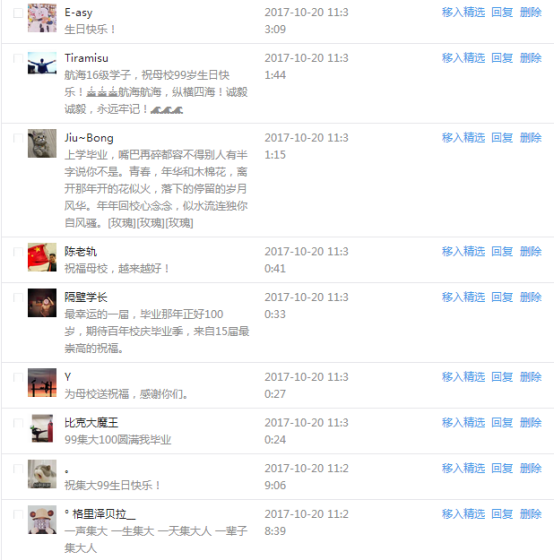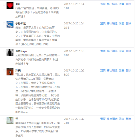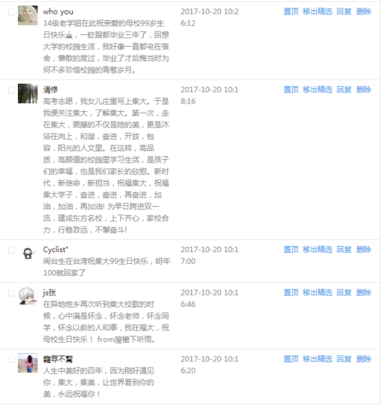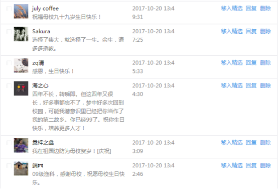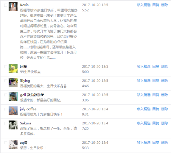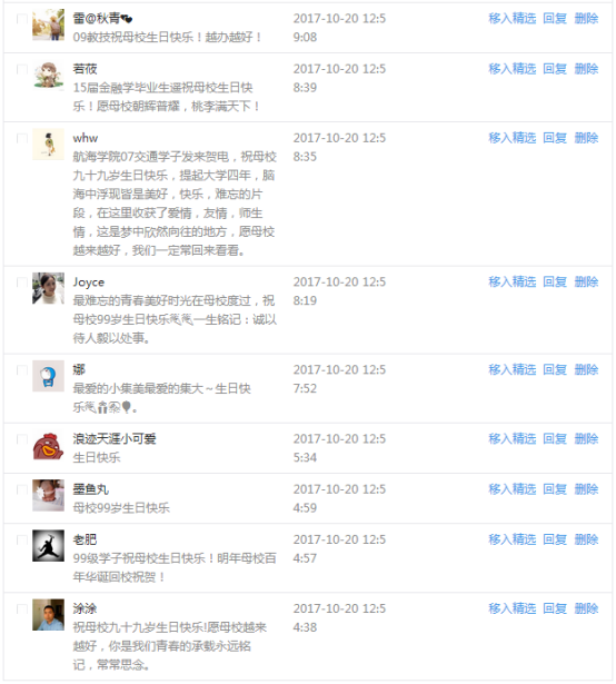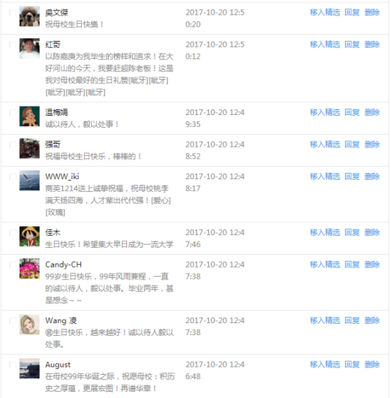 今天是我校建校99周年紀念日,學校官方微博、微信同步推送校慶日專題,得到了海內外各屆校友的積極關注,校友紛紛為母校留言點贊,截至發稿時至,微博總瀏覽量4.9萬,留言數76,點贊數222;微信推文總瀏覽量2.63萬,H5祝福專題超過50萬人次點贊祝福,微信后臺留言數681,點贊數795。海內外校友在留言中表達了對在母校學習生活的時光的懷念,感謝母校的培育,祝福母校生日快樂!希望母校越辦越好!