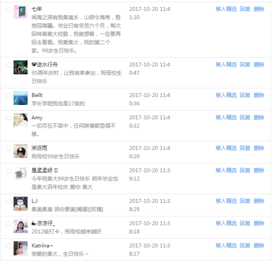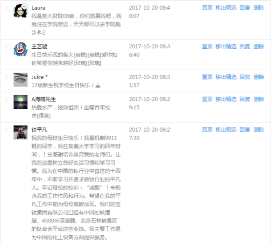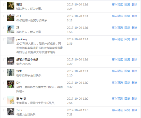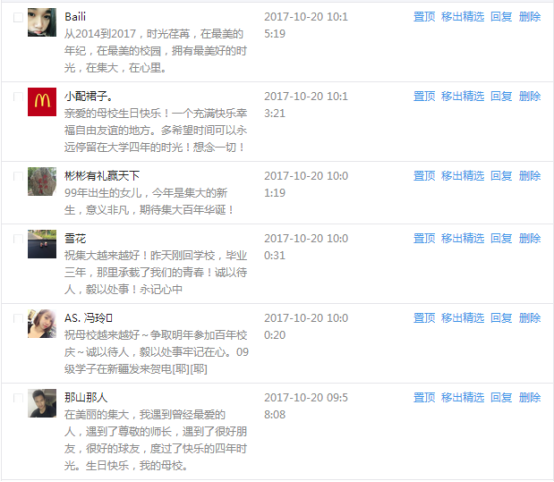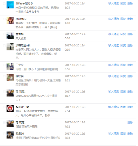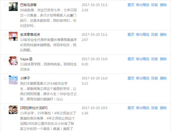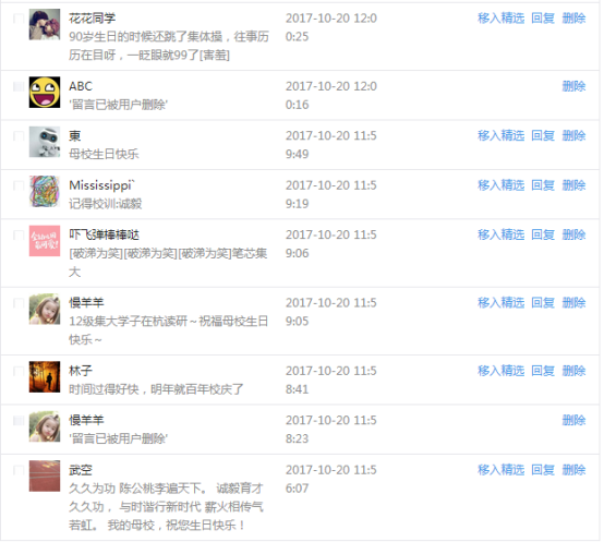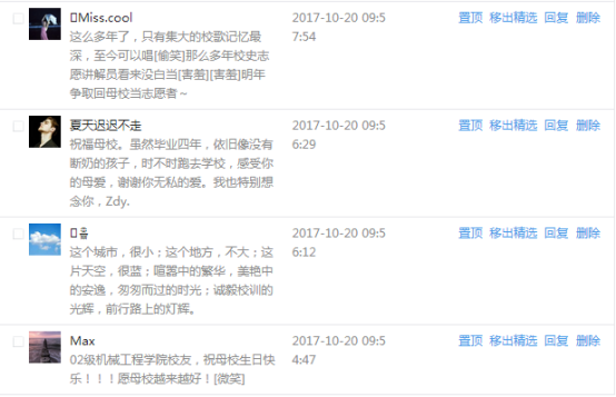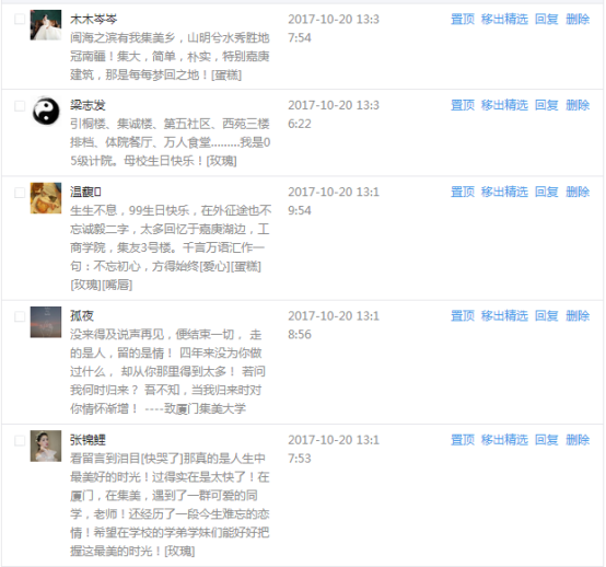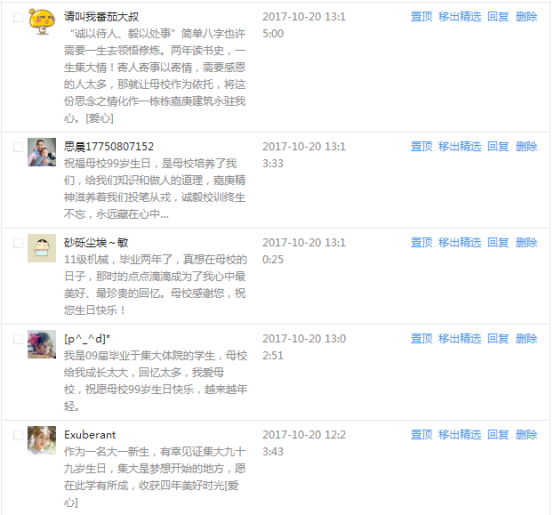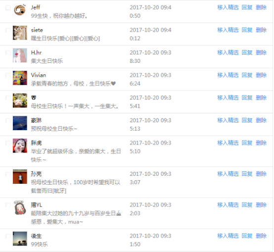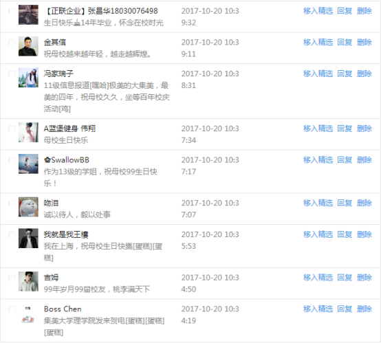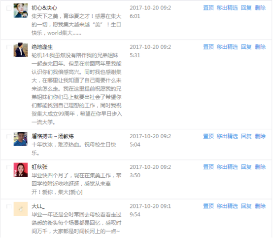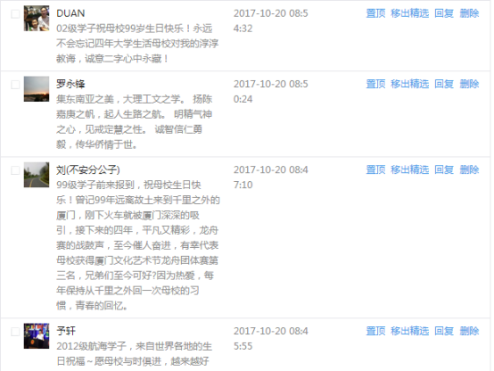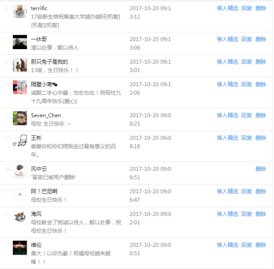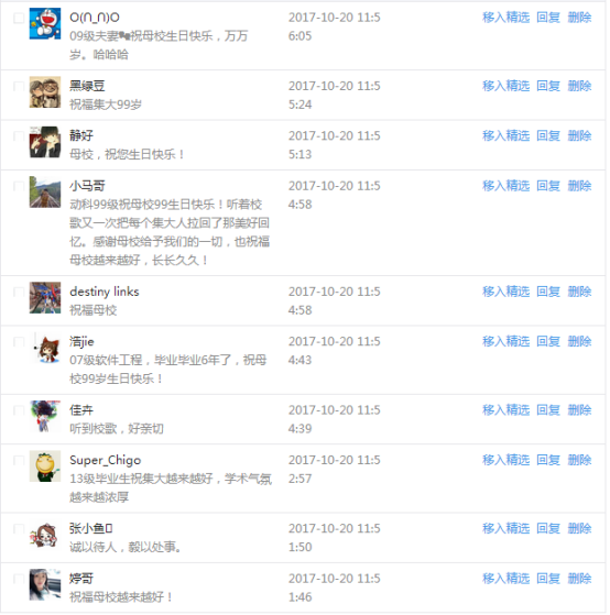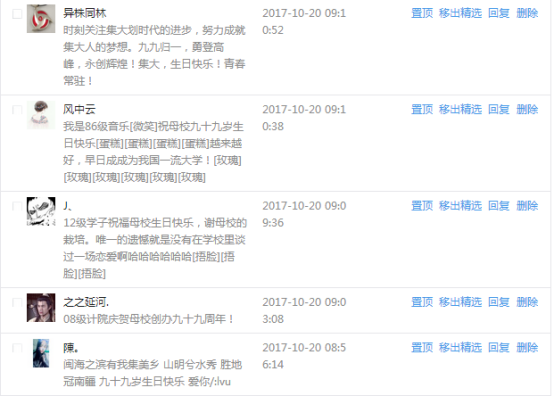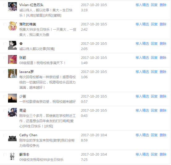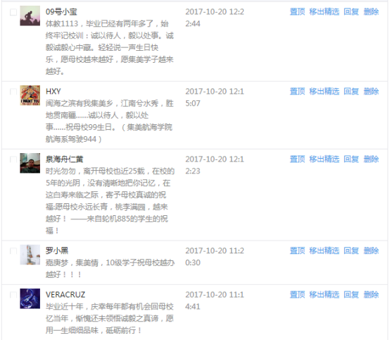 今天是我校建校99周年紀念日,學校官方微博、微信同步推送校慶日專題,得到了海內外各屆校友的積極關注,校友紛紛為母校留言點贊,截至發稿時至,微博總瀏覽量4.9萬,留言數76,點贊數222;微信推文總瀏覽量2.63萬,H5祝福專題超過50萬人次點贊祝福,微信后臺留言數681,點贊數795。海內外校友在留言中表達了對在母校學習生活的時光的懷念,感謝母校的培育,祝福母校生日快樂!希望母校越辦越好!
