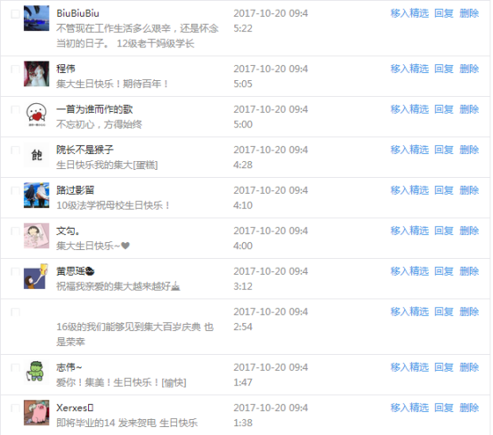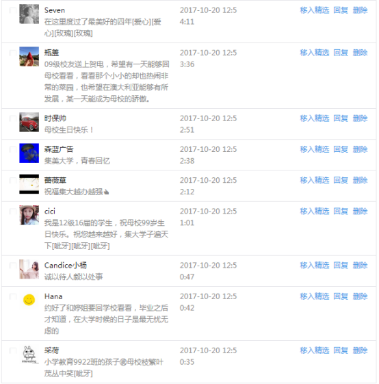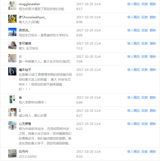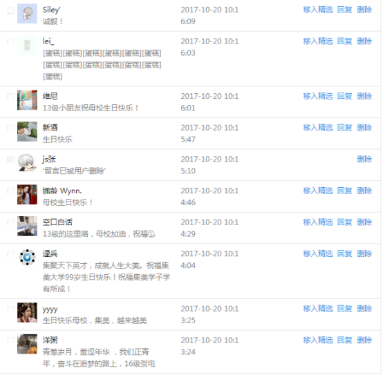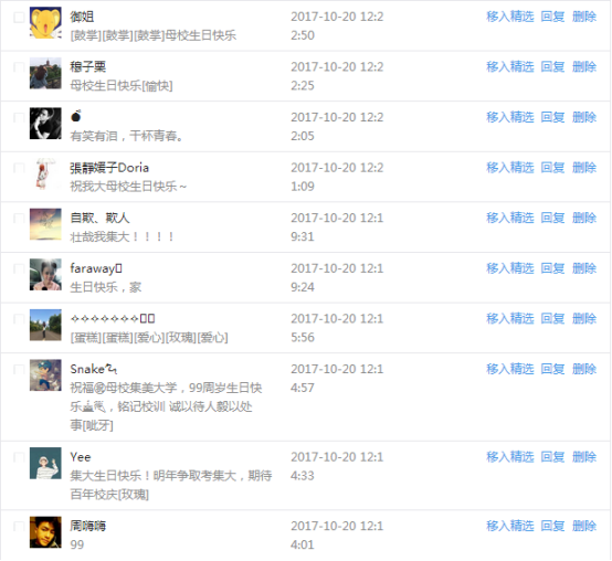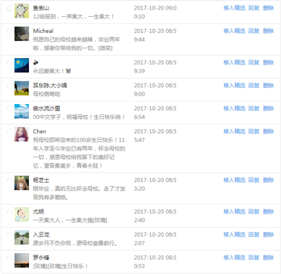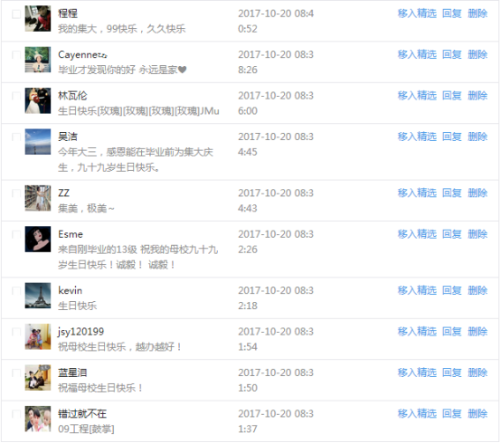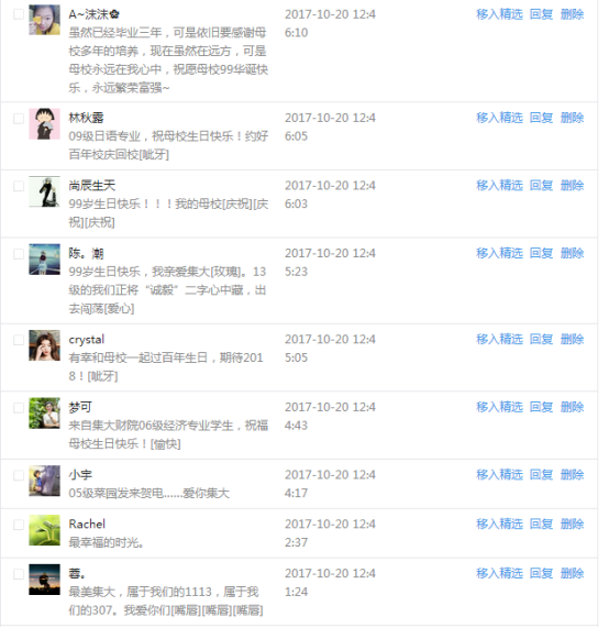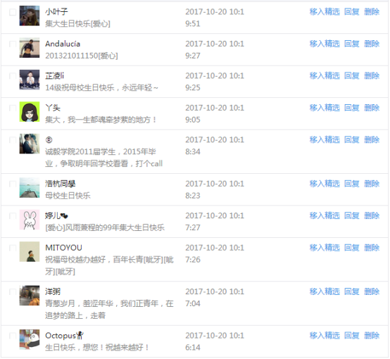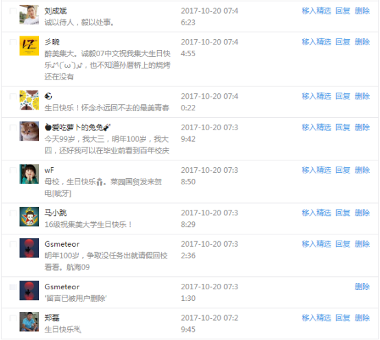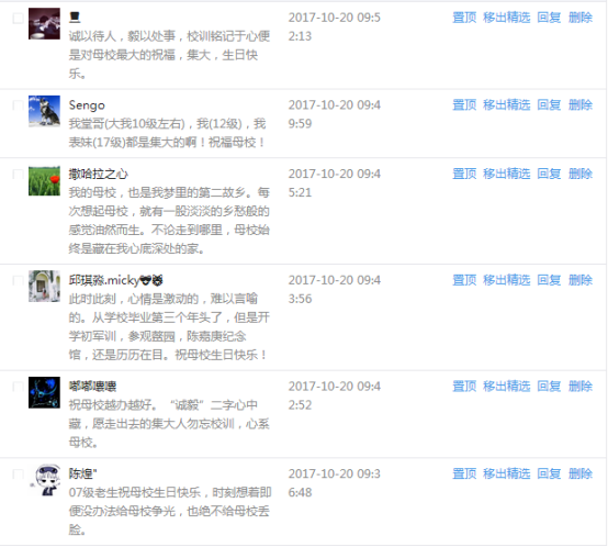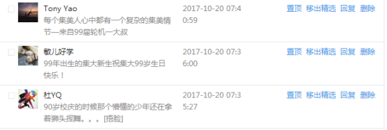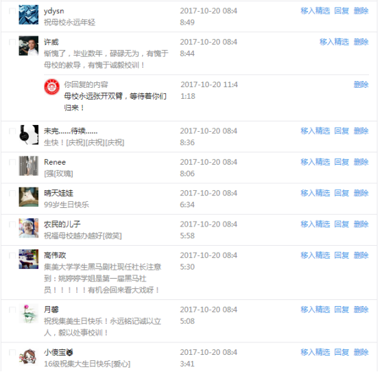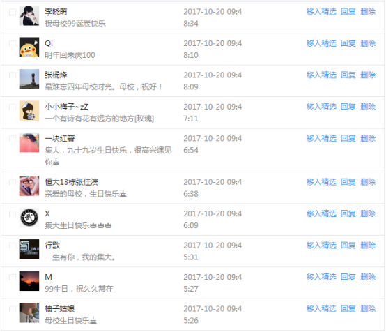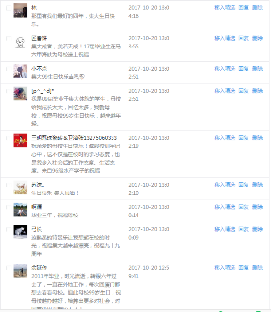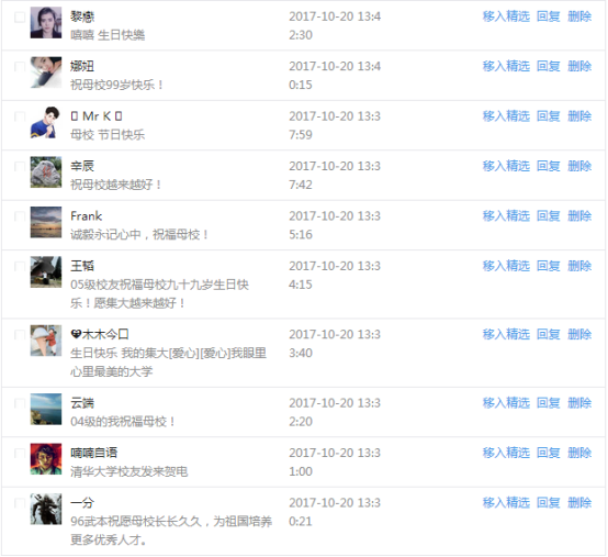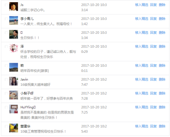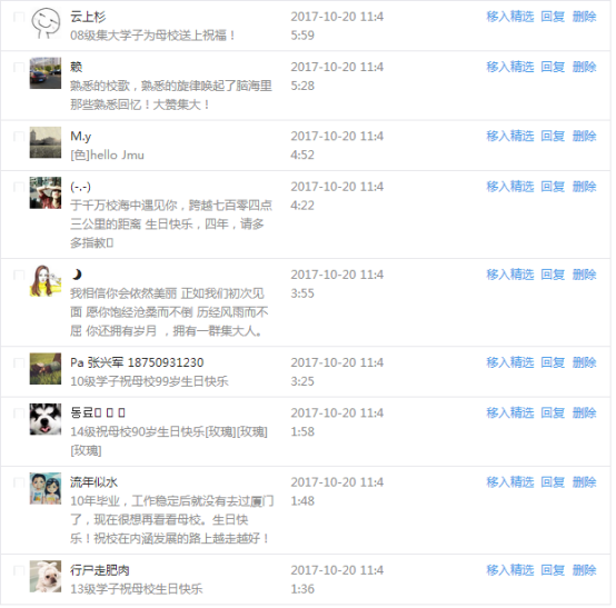 今天是我校建校99周年紀念日,學校官方微博、微信同步推送校慶日專題,得到了海內外各屆校友的積極關注,校友紛紛為母校留言點贊,截至發稿時至,微博總瀏覽量4.9萬,留言數76,點贊數222;微信推文總瀏覽量2.63萬,H5祝福專題超過50萬人次點贊祝福,微信后臺留言數681,點贊數795。海內外校友在留言中表達了對在母校學習生活的時光的懷念,感謝母校的培育,祝福母校生日快樂!希望母校越辦越好!