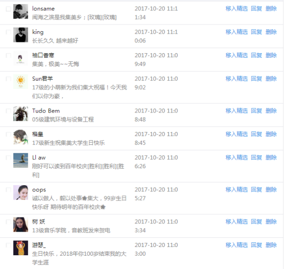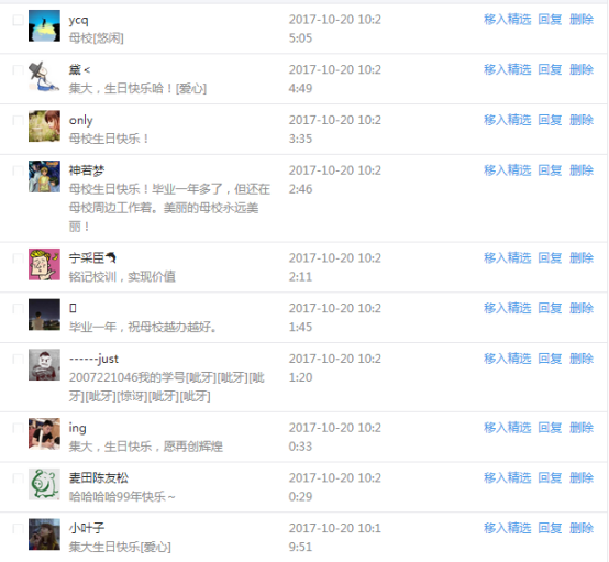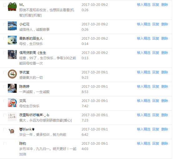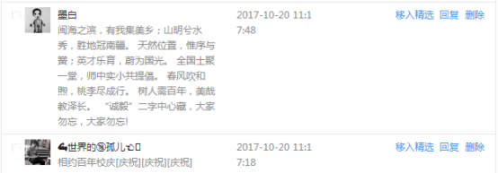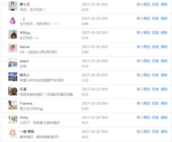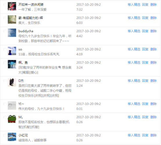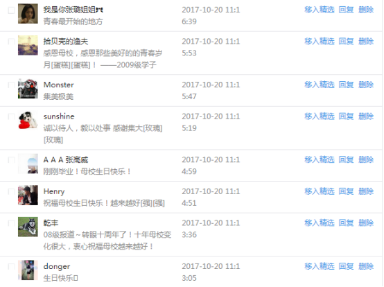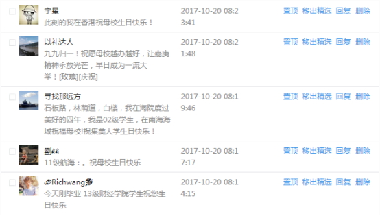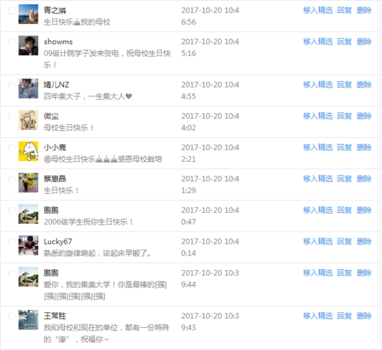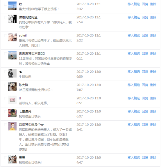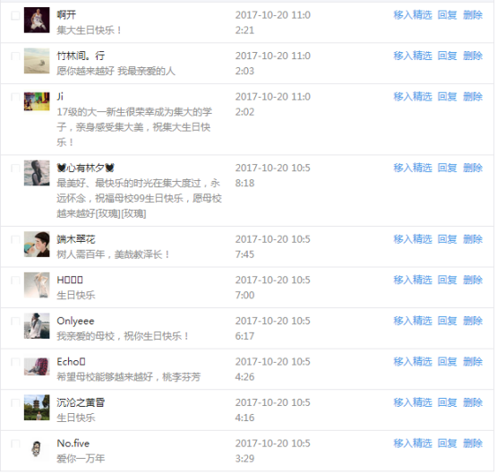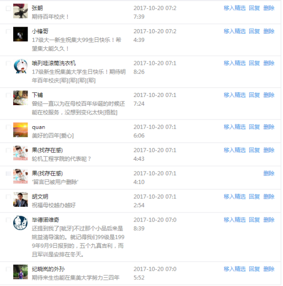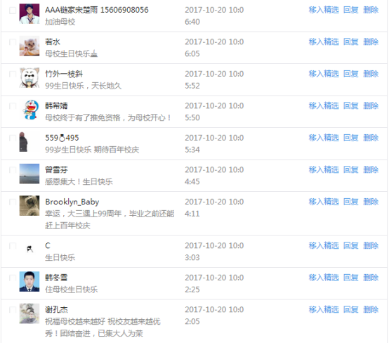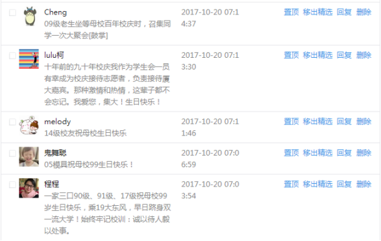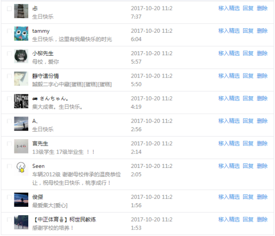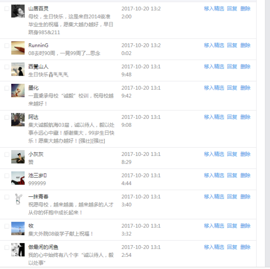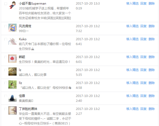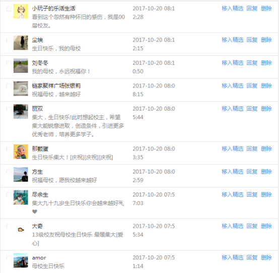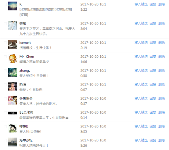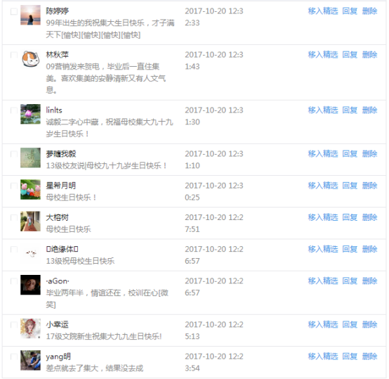 今天是我校建校99周年紀念日,學校官方微博、微信同步推送校慶日專題,得到了海內外各屆校友的積極關注,校友紛紛為母校留言點贊,截至發稿時至,微博總瀏覽量4.9萬,留言數76,點贊數222;微信推文總瀏覽量2.63萬,H5祝福專題超過50萬人次點贊祝福,微信后臺留言數681,點贊數795。海內外校友在留言中表達了對在母校學習生活的時光的懷念,感謝母校的培育,祝福母校生日快樂!希望母校越辦越好!
