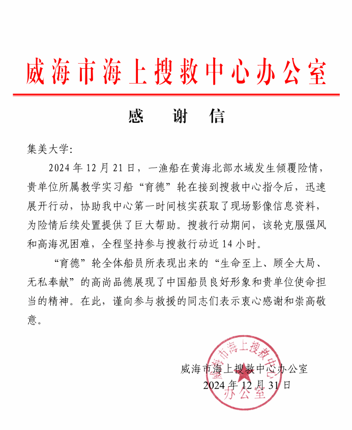 近日,我校收到威海市海上搜救中心辦公室發來的感謝信,對參與海上搜救行動的“育德”輪師生表示肯定與感謝。