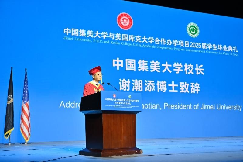 謝潮添在致辭中指出,中外合作辦學(xué)項目學(xué)生既傳承著中華文明的深厚底蘊,又具備全球公民的開放視野。希望2025屆畢業(yè)生以交流互鑒鑄就跨文化勝任力,深刻洞察不同文明的思維邏輯、價值取向,樹立真正的文化自信;以創(chuàng)新范式重構(gòu)未來競爭力,敢于做“破壁者”,以多元視角和創(chuàng)新思維,在交叉學(xué)科中創(chuàng)造連接,勇做未來世界的引領(lǐng)者;以家國情懷詮釋青年擔(dān)當(dāng)力,在各行各業(yè)勇?lián)姑们啻褐P在民族復(fù)興的偉大征程上書寫屬于千禧一代的輝煌篇章。