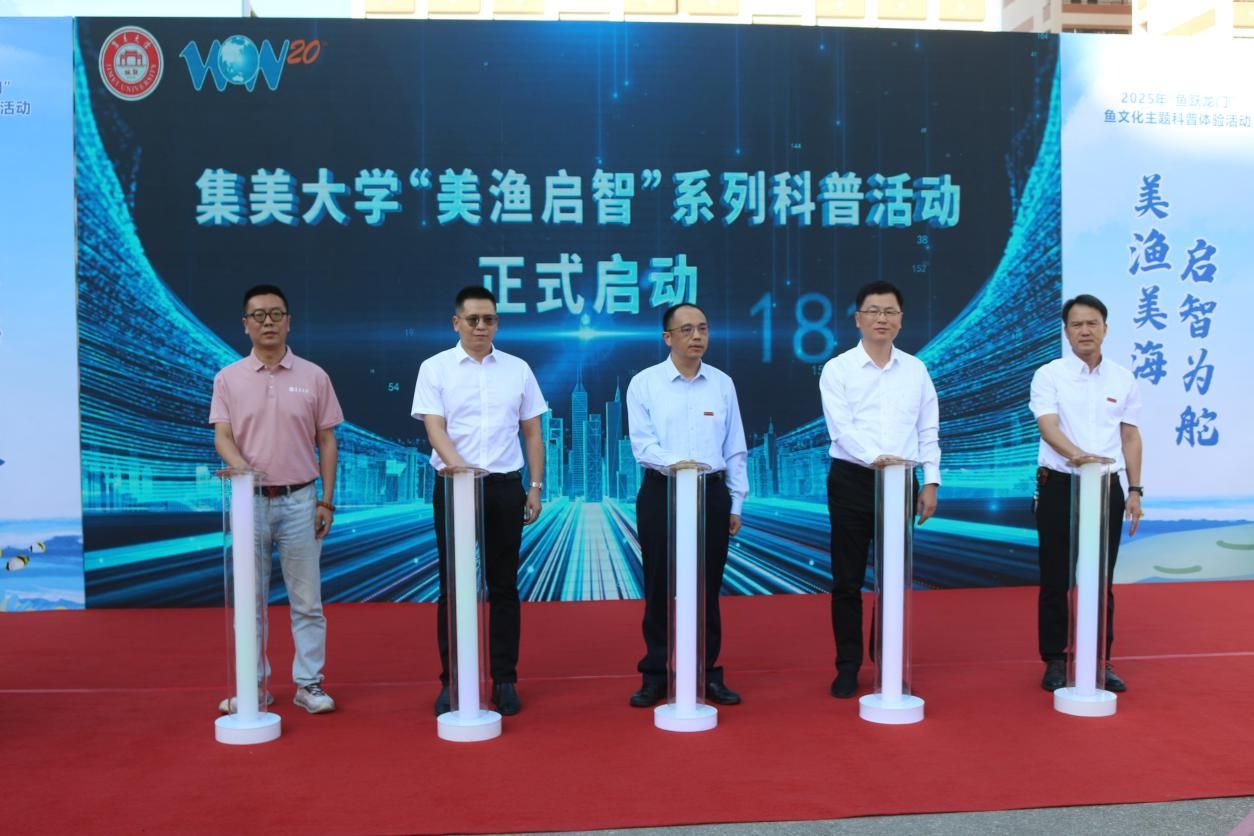 11月16日下午,以“集鮮聚趣,美漁啟智”為主題的廈門國際海洋周集美大學海洋科學開放日暨“美漁啟智”系列科普活動品牌發布會在我校舉行。校黨委副書記、校長謝潮添,廈門市海洋發展局黨組書記、局長王宇,廈門市集美區文教區管委會主任趙鵬,??蒲刑帯⑺a學院相關負責人,龍海對蝦科技小院責任專家以及師生代表等共同出席活動。