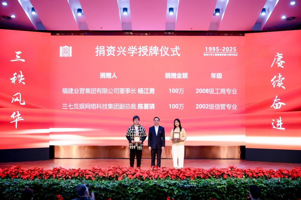 校友代表賀業敏和教師代表陳巖英分別發言。大會還舉行了“薪火相傳·致敬耕耘”退休教師獻花儀式、“三十載管院情,薪火向新行”主題朗誦、捐資興學授牌儀式以及政產學研合作協議簽訂等。
