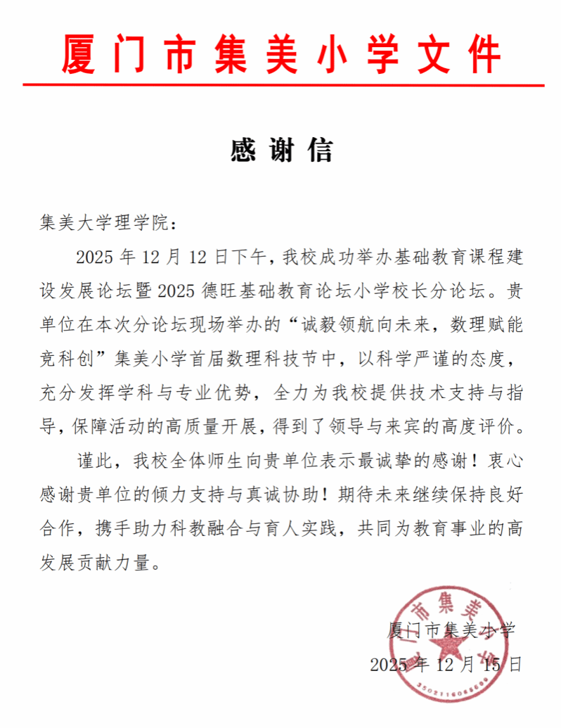 近日,廈門市集美小學(xué)向理學(xué)院發(fā)來感謝信,對學(xué)院在基礎(chǔ)教育課程建設(shè)發(fā)展論壇暨2025德旺基礎(chǔ)教育論壇中小學(xué)校長分論壇給予的支持表示感謝。
