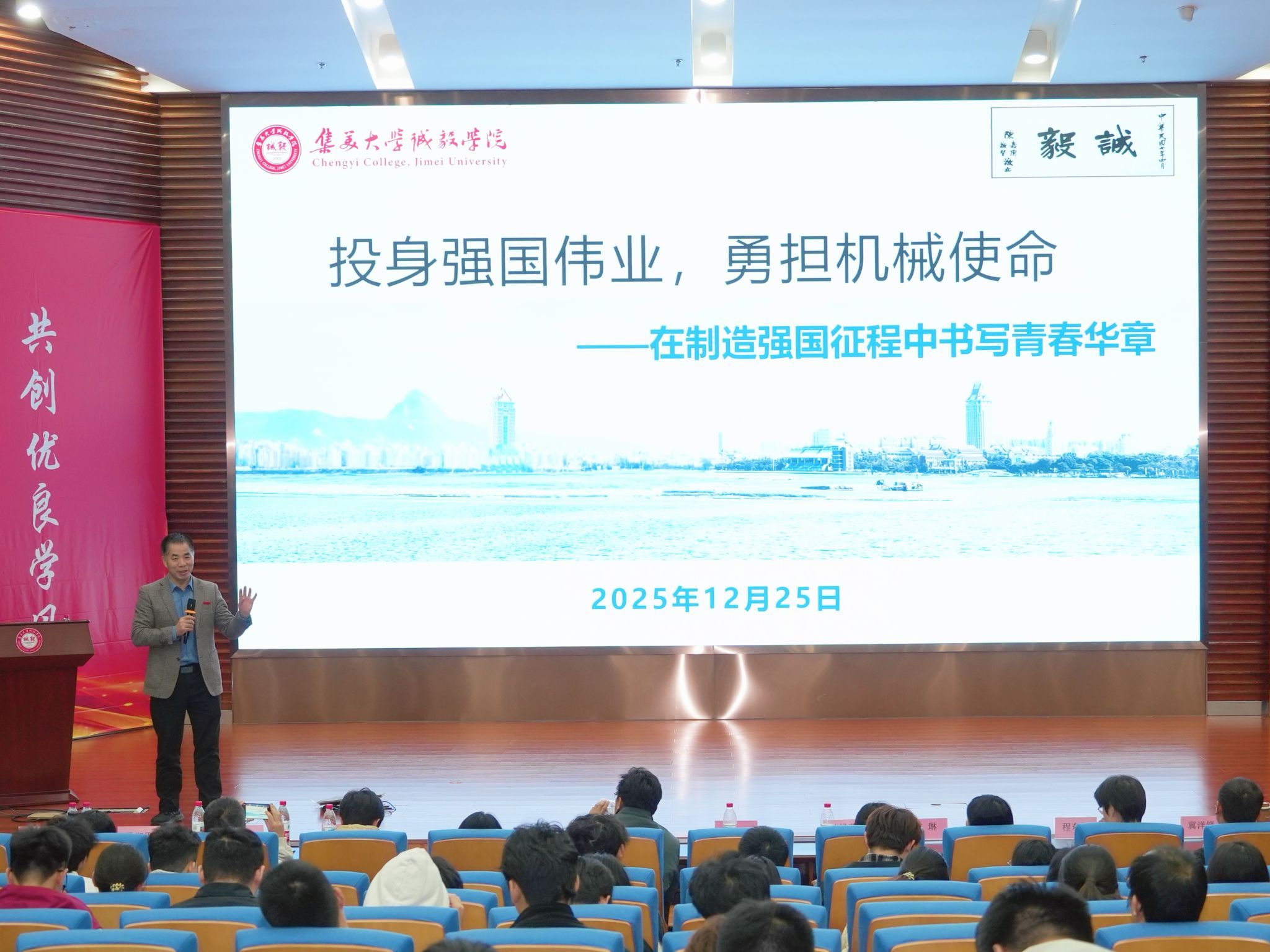12月25日晚,誠毅學院院長許志龍在景祺樓104報告廳為師生講授專題思政課,并觀摩了學生科創項目分享會。系(院)領導、教師代表,智能制造與機械工程系、體育與藝術系學生代表共同參加。