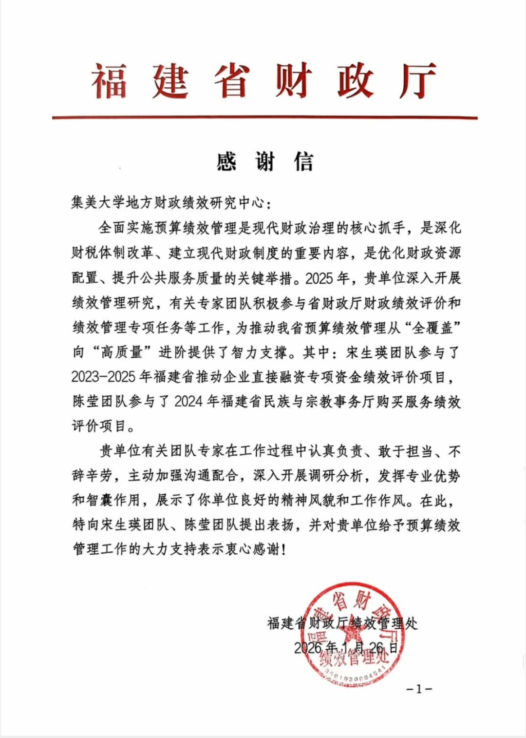 近日,福建省財政廳績效管理處向集美大學地方財政績效研究中心發來感謝信,充分肯定并感謝中心教師在深入開展績效管理研究的基礎上,積極參與財政績效評價和績效管理專項任務,為推動福建省預算績效管理從“全覆蓋”向“高質量”進階提供了智力支撐。