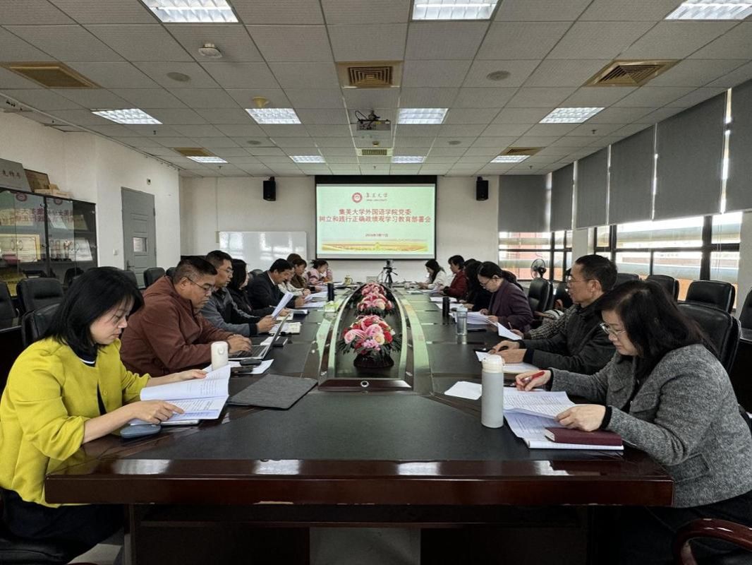 3月11日,外國語學院黨委召開樹立和踐行正確政績觀學習教育部署會。會議由院黨委書記黃建宇主持,院領導班子、師生黨支部書記、科級干部參加會議。
