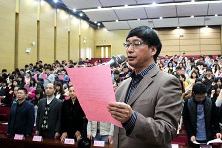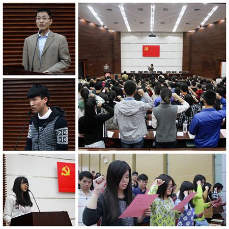 入黨宣誓儀式隨著激昂的《國際歌》拉開了序幕。新黨員們在連志崧的帶領下,面向黨旗,莊嚴宣誓。新黨員代表吳文輝和呂鴻分別發言。他們表示要思想上更加嚴格要求自我,真正落實自己在黨旗下許下的莊嚴承諾,努力為同學服務,時刻準備著為黨和國家的事業發展貢獻自己的一份力量! 宣誓后,朱晨光作了總結講話。他指出新黨員要有堅定的理想信念,要明是非、守紀律,自覺接受黨組織的教育和培養,不斷加強政治理論學習,提高自身綜合素質;同時,新黨員要在本職崗位上發揮先鋒模范作用,緊密團結群眾、服務群眾。他說學院新時期辦學目標的實現離不開黨員作用的發揮,希望新黨員們不斷提高責任感和使命感,以實際行動為學院發展作出貢獻,為黨的事業增輝添彩。