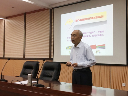 5月3日下午,文學院舉辦“鷺江講壇”。本次講壇以“解讀金磚國家,迎接廈門會晤”為主題,邀請廈門市委黨校原常務副校長施鳳堂主講。學院黨委書記宋水安、黨委副書記陳娟,及全體教職工、學生黨員和入黨積極分子聆聽了講座。