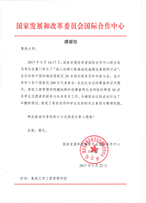 近日,國家發(fā)展和改革委員會國際合作中心向我校發(fā)來感謝信,就我校積極參與、順利完成“海上絲綢之路基礎(chǔ)設(shè)施建設(shè)高級研討會”會務(wù)工作表達(dá)謝意。