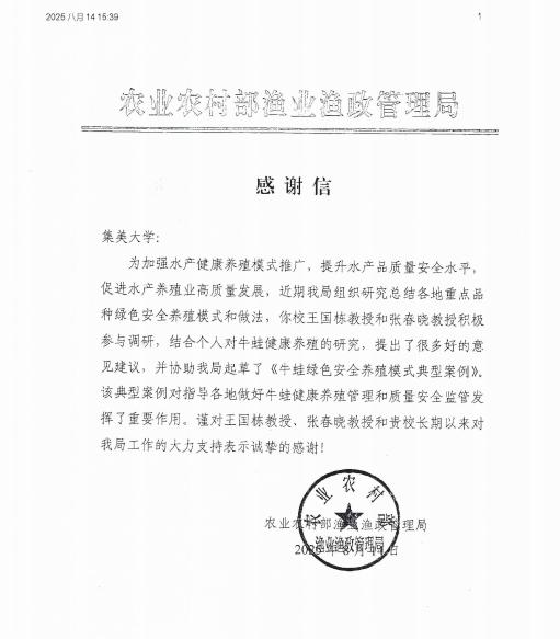 近日,農(nóng)業(yè)農(nóng)村部漁業(yè)漁政管理局向我校發(fā)來感謝信,對我校王國棟教授、張春曉教授在推廣水產(chǎn)健康養(yǎng)殖模式、提升水產(chǎn)品質(zhì)量安全水平、促進水產(chǎn)養(yǎng)殖業(yè)高質(zhì)量發(fā)展工作中的積極貢獻表示感謝。