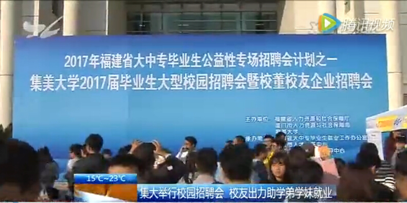 12月7日,我校舉行2017屆畢業(yè)生大型校園招聘會(huì)暨校董校友企業(yè)招聘會(huì)。廈門電視臺(tái)記者到現(xiàn)場(chǎng)采訪報(bào)道,并在特區(qū)新聞廣場(chǎng)節(jié)目中,以《集大舉行校園招聘 校友出力助學(xué)弟學(xué)妹就業(yè)》為題進(jìn)行了報(bào)道。
