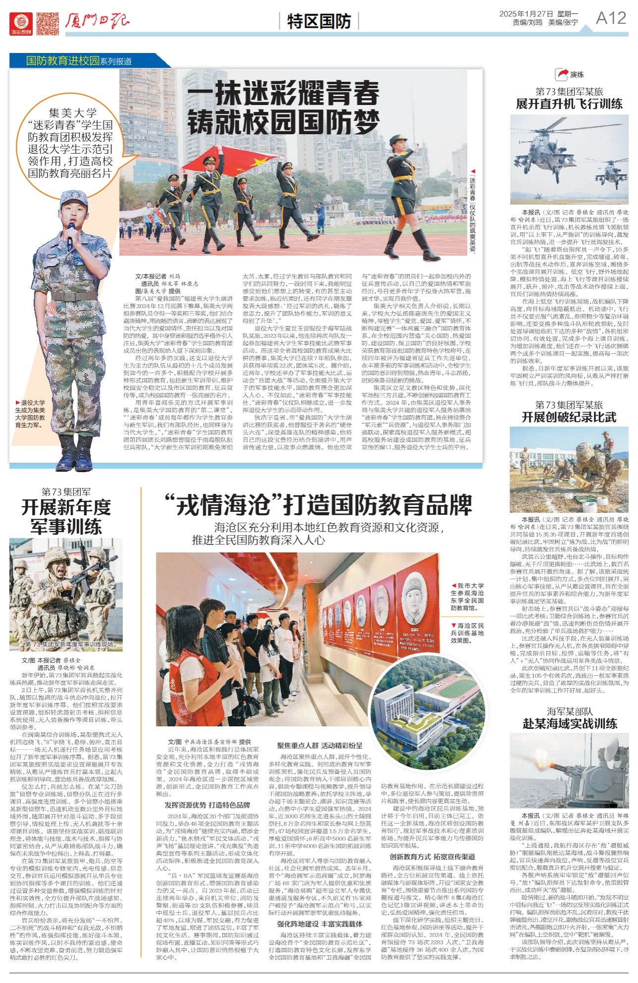 集美區(qū)立足文教區(qū)特色和優(yōu)勢,深化軍地校三方共建,不斷創(chuàng)新校園國防教育工作方式。2024 年,由集美區(qū)退役軍人事務(wù)局與集美大學(xué)共建的退役軍人服務(wù)站落地“迷彩青春”學(xué)生國防教育團(tuán),旨在持續(xù)整合“軍元素”“兵資源”,與退役軍人事務(wù)部門加強(qiáng)聯(lián)動,探索高校退役軍人服務(wù)新模式,把高校服務(wù)站建設(shè)成國防教育的基地、征兵宣傳的窗口、服務(wù)退役大學(xué)生士兵的平臺。