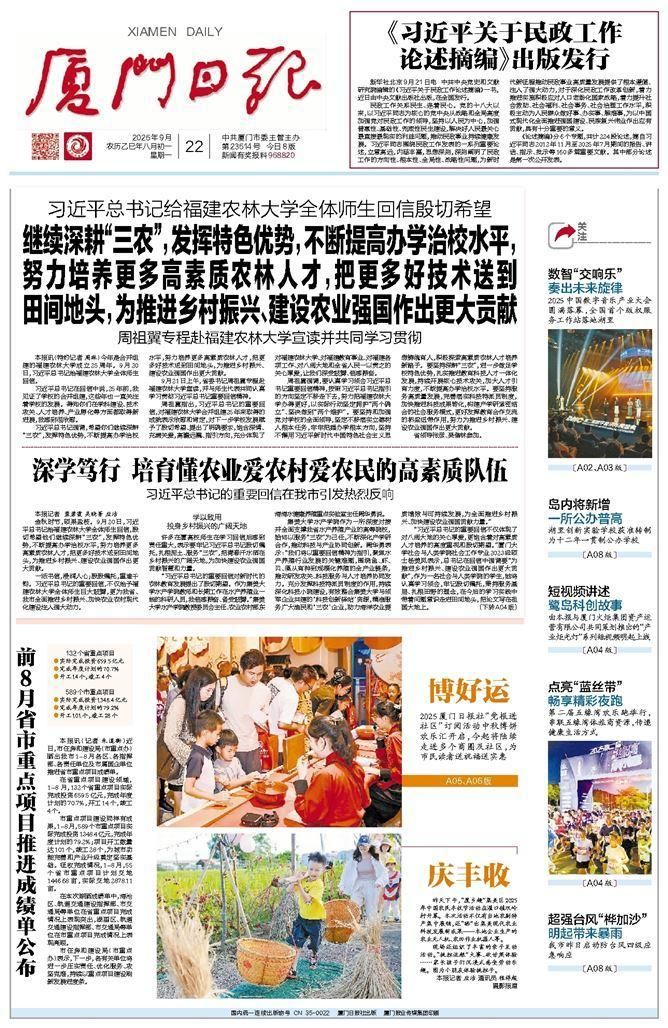 廈門高度重視“三農(nóng)”工作,將農(nóng)業(yè)農(nóng)村現(xiàn)代化作為“努力率先實現(xiàn)社會主義現(xiàn)代化”的重要組成部分,持續(xù)推進鄉(xiāng)村振興、城鄉(xiāng)融合。習(xí)近平總書記給福建農(nóng)林大學(xué)全體師生的回信,對廈門深化農(nóng)業(yè)農(nóng)村改革、農(nóng)林人才培養(yǎng)、發(fā)展都市現(xiàn)代農(nóng)業(yè)、打造宜居宜業(yè)和美鄉(xiāng)村,具有重要的指導(dǎo)意義。